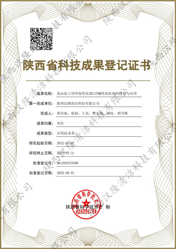 近日,陜西漢隆清潔科技有限公司自主研發(fā)的兩項科技成果——“食品加工用環(huán)保型高效CIP堿性清洗劑的研究與應用”和“食品級堿性泡沫清洗劑的研究與應用”,榮獲陜西省科技廳頒發(fā)的“陜西省科技成果登記證書”。這不僅是對公司在食品清潔領域創(chuàng)新研發(fā)能力的高度認可,更是為食品加工行業(yè)的綠色化、智能化發(fā)展注入了強勁動力。