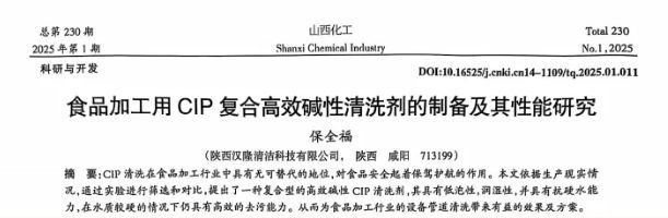 2、保全福在《山西化工》雜志發(fā)表論文《食品加工用CIP復合高效堿性清洗劑的制備及其性能研究》
